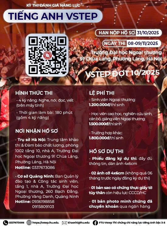 Trường Đại học Ngoại thương thông báo về việc tổ chức thi và cấp chứng chỉ năng lực tiếng Anh theo Khung năng lực ngoại ngữ 6 bậc dùng cho Việt Nam, kỳ thi ngày 08-09/11/2025, cụ thể như sau: