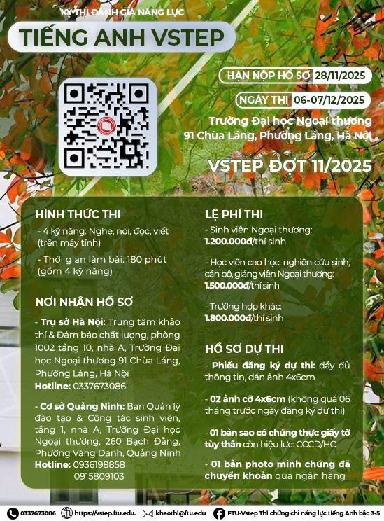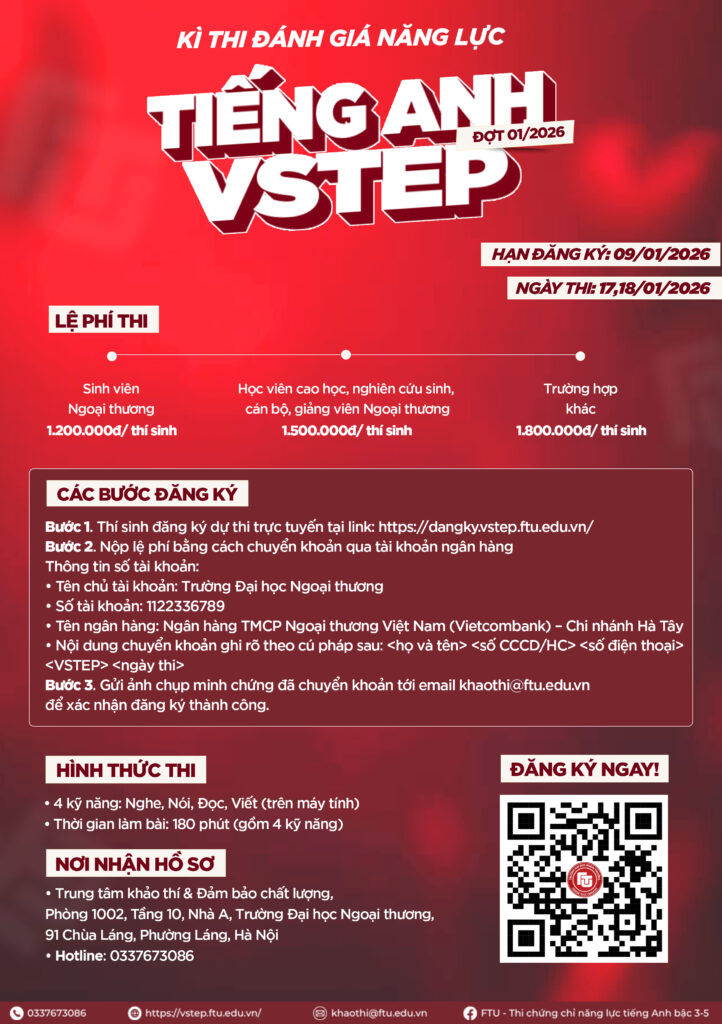 Trường Đại học Ngoại thương thông báo về việc tổ chức thi và cấp chứng chỉ năng lực tiếng Anh theo Khung năng lực ngoại ngữ 6 bậc dùng cho Việt Nam, kỳ thi ngày 17-18/01/2026, cụ thể như sau: